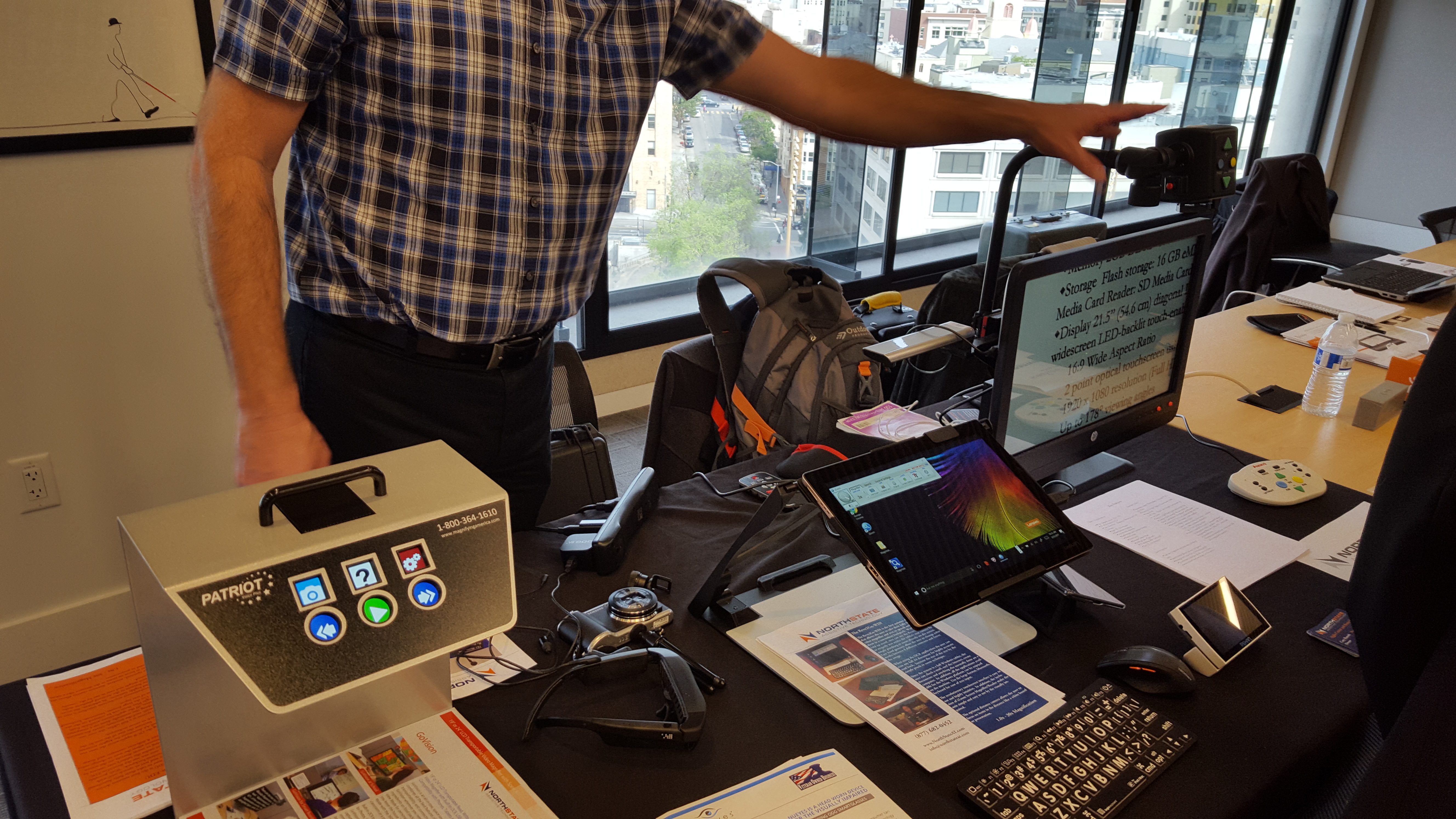 Table with device called the Patriot Voice Plus Reading Machine, eSight Glasses, Mobile Screen magnifier and a desktop Screen Magnifier
