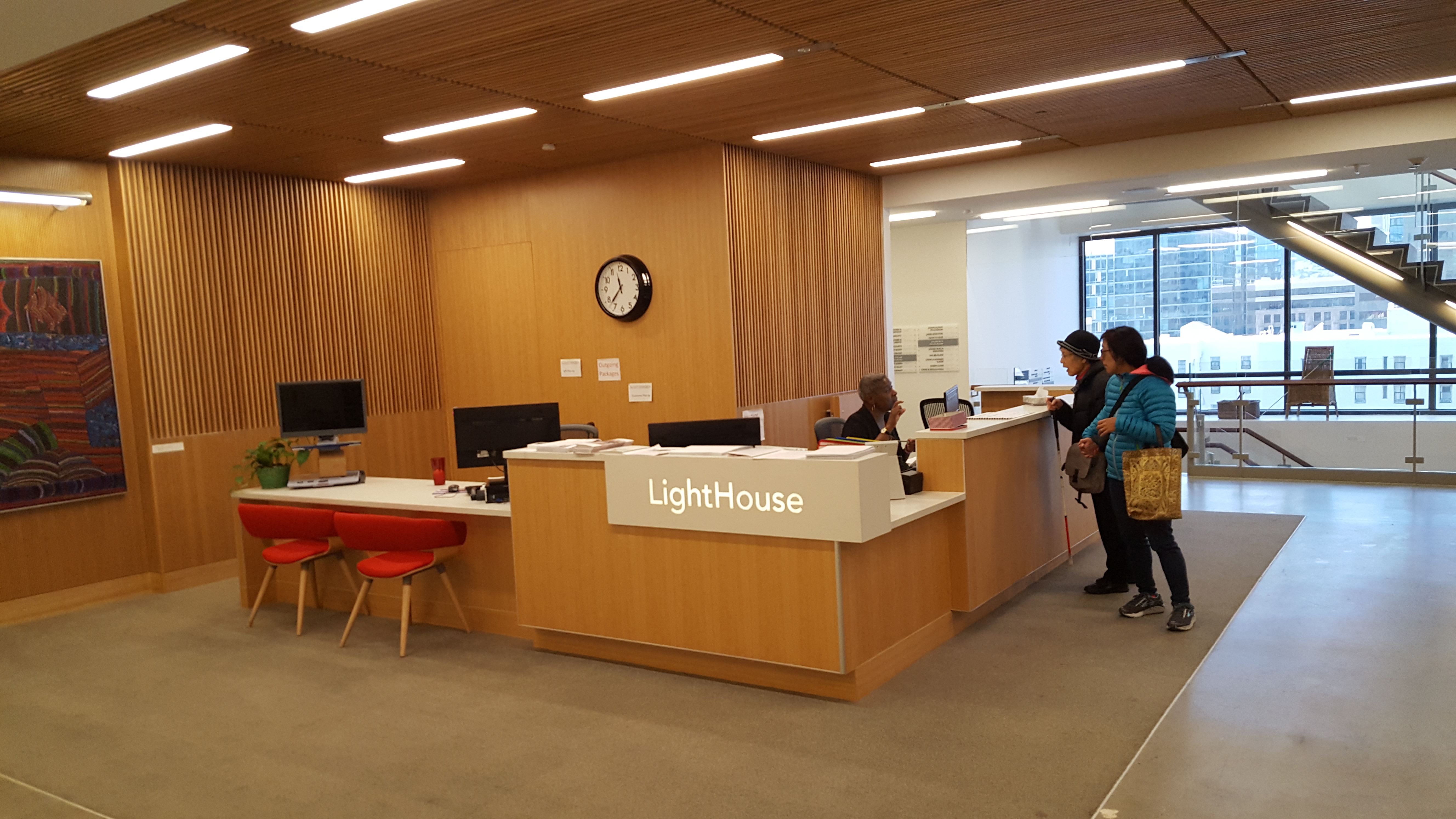 > Reception desk at the Lighthouse for the Blind in San Francisco