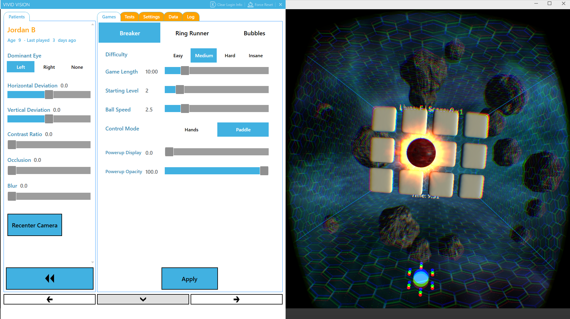 This is what a loaded game looks like. You can change settings using the interface on the left. Hit apply to send those settings to the HMD.