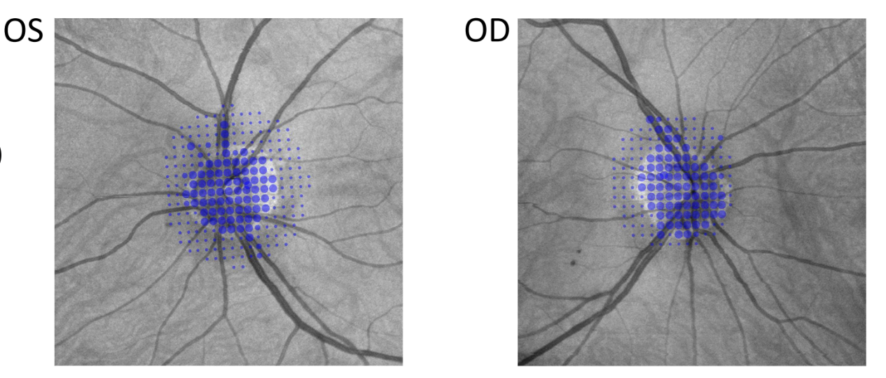 Example of lesion-customized grids placed on the physiological blind spots of a normally-sighted person. VVP is precise enough to measure individual blood vessels leaving the optic nerve head.